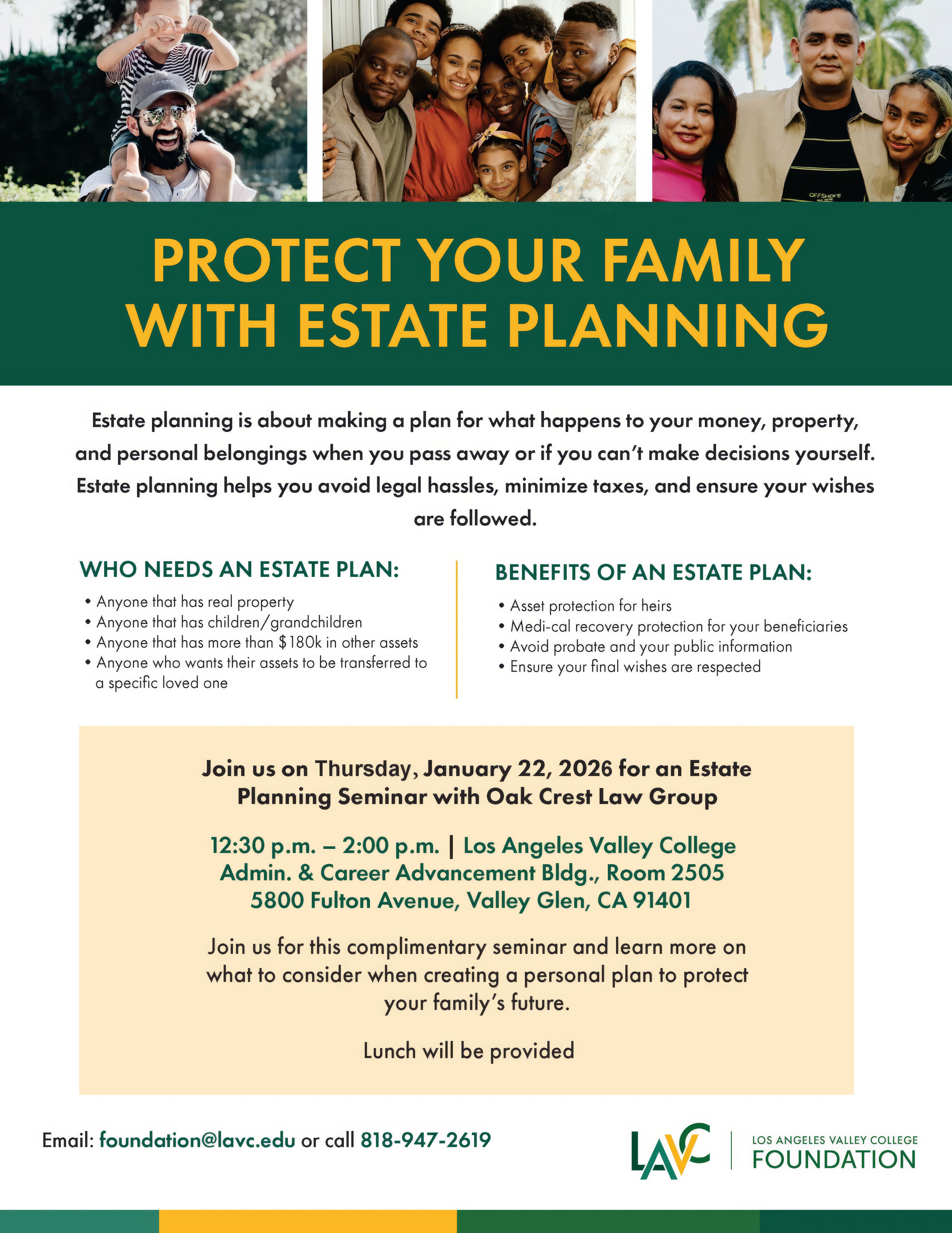 Join us for our next meeting on November 18, 2025 at 6:00 p.m. in ACA 2504. For more information, contact the Foundation at foundation@lavc.edu.